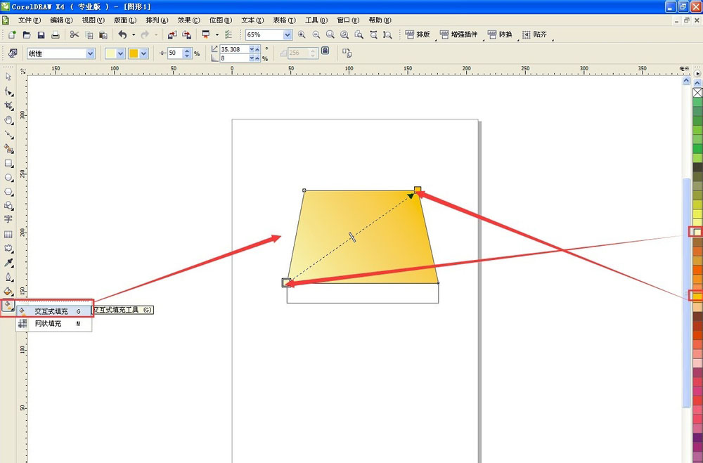 3、選擇交互式填充工具,拉出一個線性漸變,顏色從深黃到淺黃。