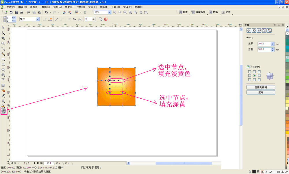 選網(wǎng)狀填充工具,方形中間的上面兩節(jié)點(diǎn)選淡黃色,下面兩節(jié)點(diǎn)選深黃色