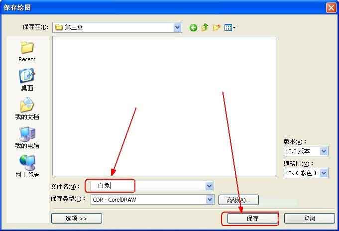 2、選擇“文件”→“保存”命令,打開“保存繪圖”對話框,在對話框中設置文件名為“白兔”,保存類型為CDR-CorelDRAW,然后單擊“保存”按鈕即可將該圖形文件保存,如圖所示。