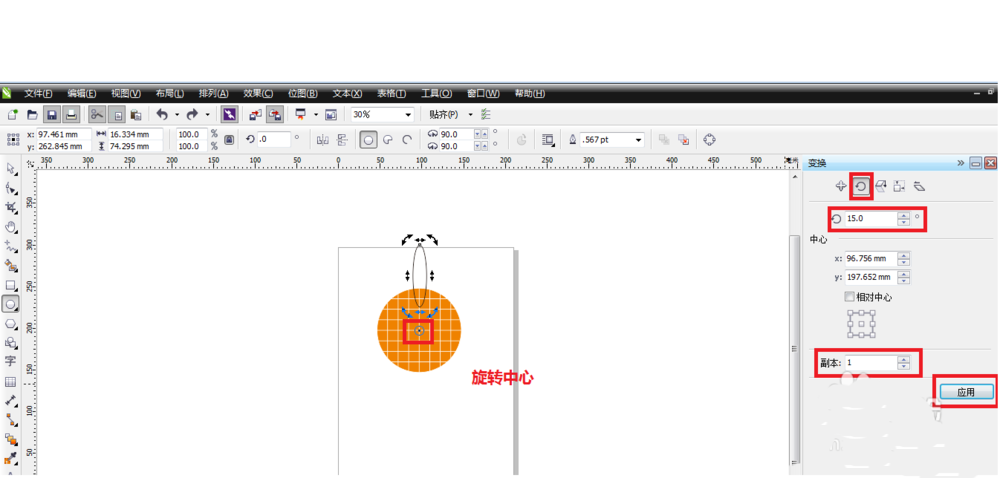 6、選中剛剛繪制的橢圓,按alt+F8進入旋轉面板。按如圖所示進行設置,設置完成后單擊應用。