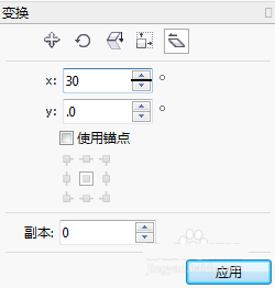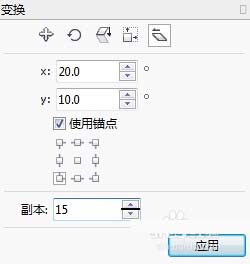 2、輸入適當(dāng)?shù)腦和Y值,如X值:20、Y值:10。勾選“使用錨點(diǎn)”,選擇某一錨點(diǎn),如“左下”。輸入需要的副本數(shù)量,如15。