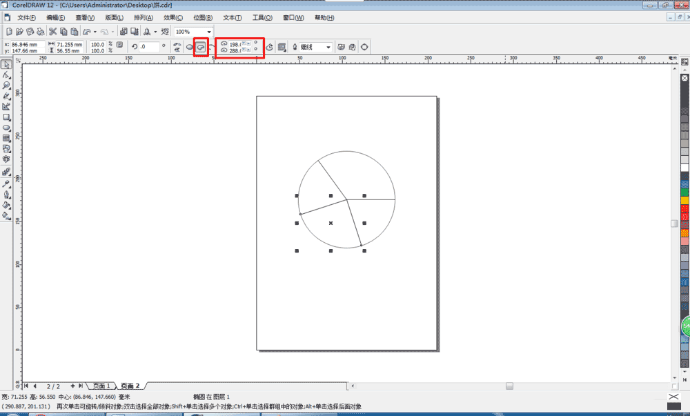 5、單擊選擇另一個圓。點擊屬性欄上的餅形,設置起始角度為126,結束角度為198。