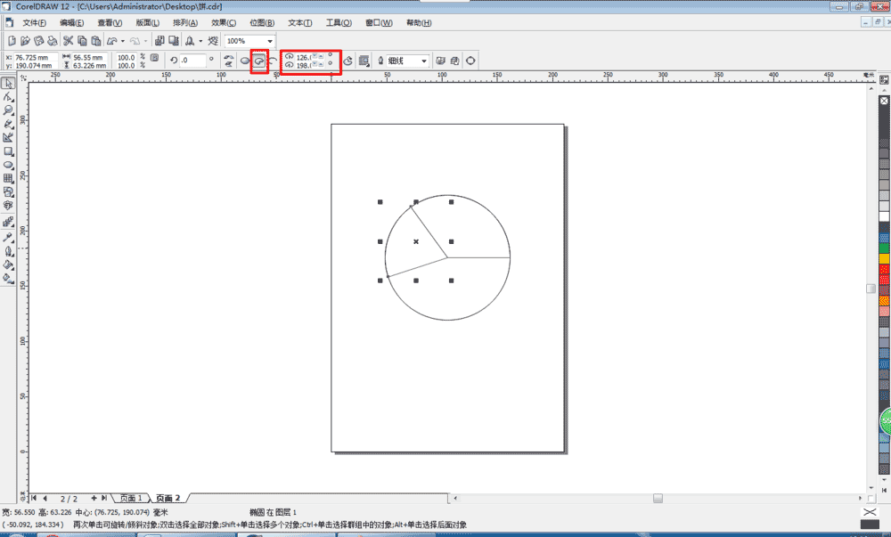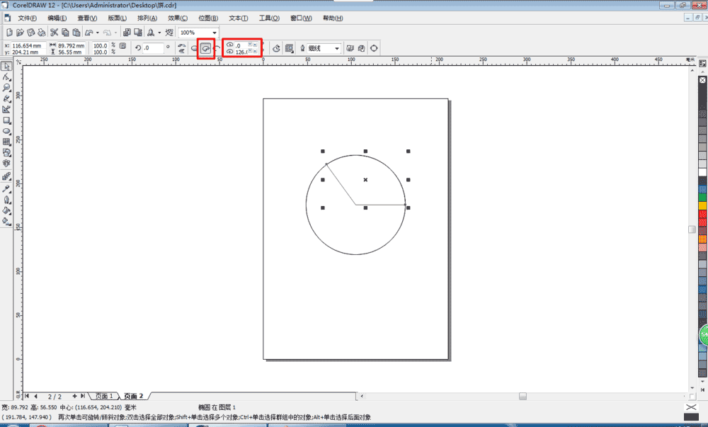 4、單擊選擇一個圓。點擊屬性欄上的餅形,設置起始角度為0,結束角度為126。