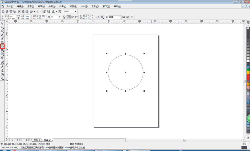2、打開coreldraw軟件,新建一個文件,單擊工具箱中的橢圓工具,或者按快捷鍵F7,按住ctrl鍵,同時按住鼠標左鍵拖動繪制一個圓