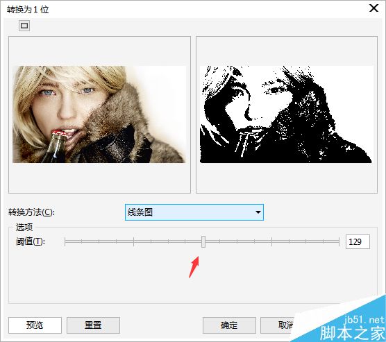 3. 在打開的“轉換為1位”對話框中,默認的轉換方法為“線條圖”,再調整“閾值”選項(根據不同圖片調整的數值不定,以圖像顯示效果為準),可以做出類似黑白素描筆觸的效果,如圖所示。