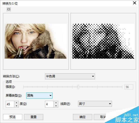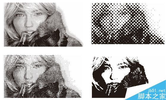 5. 很多人對“半色調”效果很好奇,其實在CDR中有著和PS一樣的處理方式,在黑色模式中依然能夠看到半調網屏的效果,而且CDR中提供更多的選項來設置您想要的半色調類型。它可以使圖片的顯示效果變成黑白灰狀態的半調網屏模式,產生類似無彩報紙一樣效果。