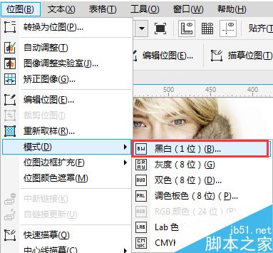 2. 選擇位圖后,單擊菜單欄中的“位圖>模式>黑白”命令。
