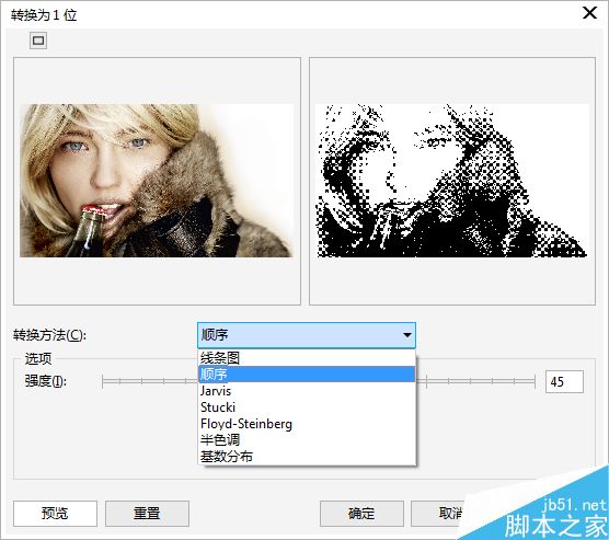 4. 切換轉換方式為“順序”,調整強度滑竿。得到類似點繪筆觸的黑白藝術圖片效果,如圖所示。
