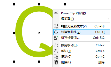 2. 選中字母,鼠標右鍵單擊字母,在彈出的快捷菜單中選擇“轉換為曲線”命令(快捷鍵Ctrl+Q),如圖。