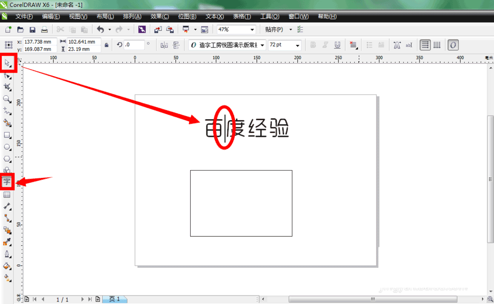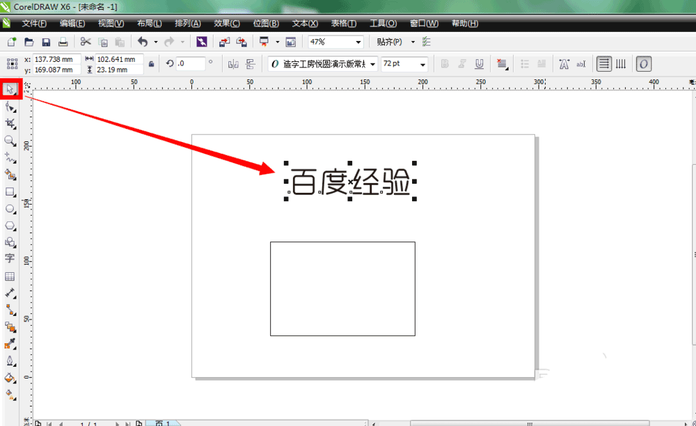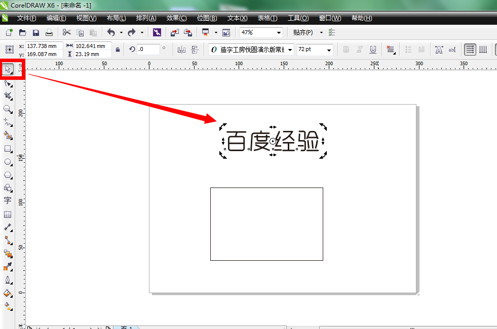 3、我們使用選擇工具,單擊文字或者矩形,文字、矩形都是僅僅處于被選中的狀態(tài)而已
