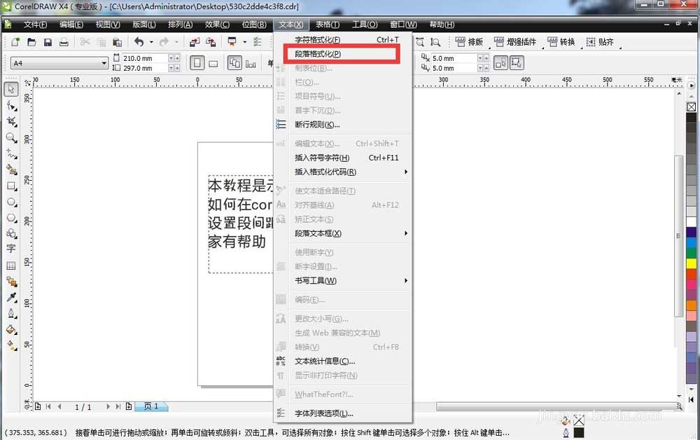 剛接觸coreldraw時經常會為找不到字體行間距、段間距而苦惱,它不像photoshop那樣直接設置,因此在這里也給大家分享下我的經驗,希望能幫到剛接觸coreldraw的你。