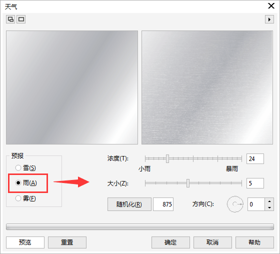 3. 此時“位圖”菜單下的各項命令就被激活了,在圖片選中狀態下,單擊“位圖>創造性>天氣”濾鏡,設置“雨”效果,并調節對話框中相關參數(可以自定義預覽模式,以方便查看對比效果)。