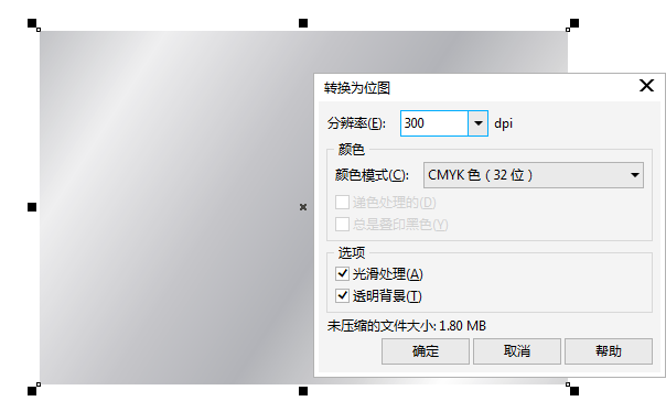 2. 將矢量圖轉換為位圖,單擊菜單欄“位圖>轉換為位圖”命令,打開“轉換為位圖”對話框,設置相關參數選項后,單擊“確定”按鈕。