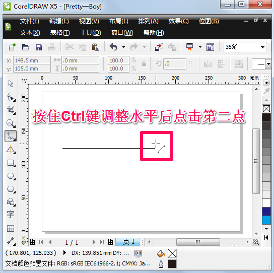 3、這時按住Ctrl鍵,線會以15度角變化,水平向右托就會是直線,再下一點單擊就畫好直線了。