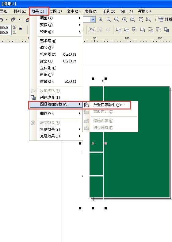 4、用矩形工具框選這幾個白色的矩形,點擊菜單【效果---圖框精確裁剪---放置在容器中】。