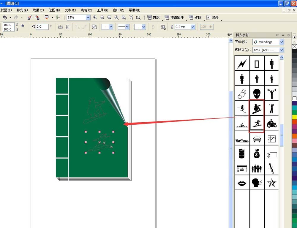 7、然后點擊菜單【文本---插入符號字符】,在彈出來的框框里選擇字體為webdings,然后找到兩個圖片,把他們拖出來。