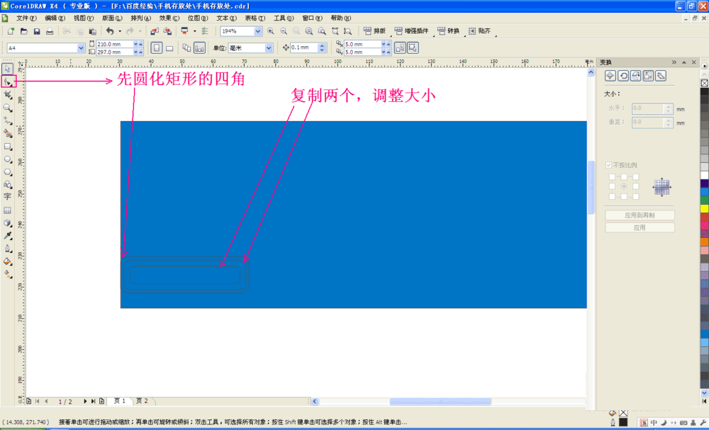 圓化矩形的四個(gè)角,再?gòu)?fù)制出兩個(gè),大小調(diào)整如圖