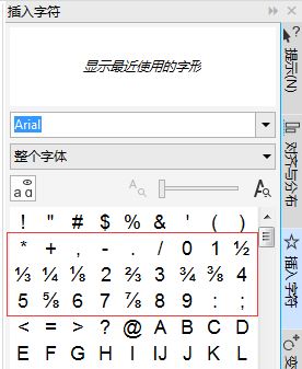 5. 從“整個字體”列表框中選擇心儀字體,選擇要插入的分數符號,直接拖拽到工作區域即可;或者把符號字符當做一個文本插入。使用文本工具,在頁面的空白位置上單擊一下,就會出現一個閃爍的光標,鼠標雙擊符號字符面板上的某個符號。