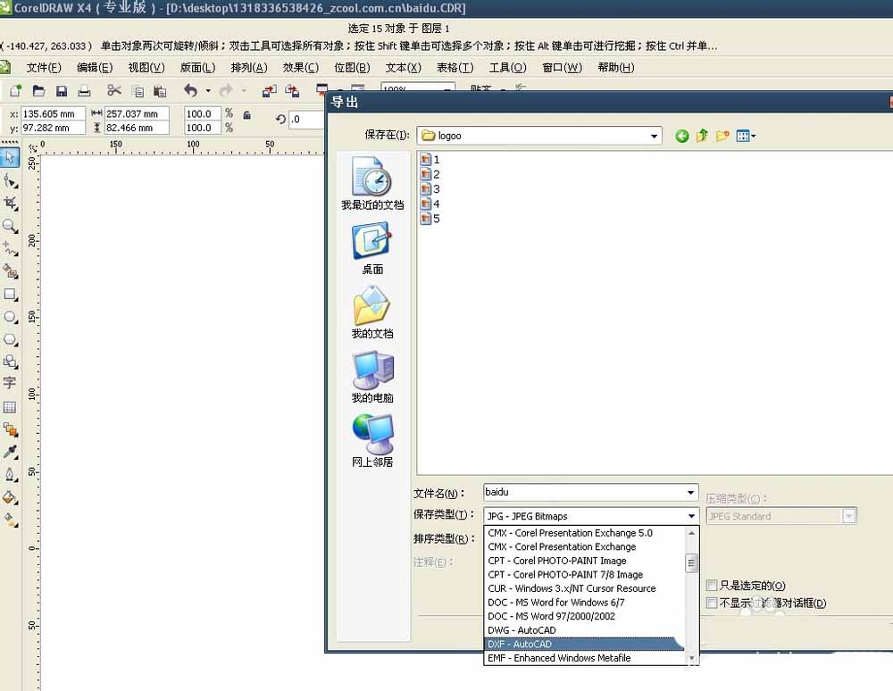 3、在cdr刪除多余的,只留一個logo文件,然后另存為dxf文件。