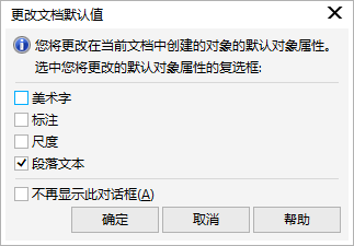 或者在沒(méi)有選擇文本的狀態(tài)下,則會(huì)跳出“更改文檔默認(rèn)值”復(fù)選框,選擇你需要更改對(duì)象屬性的選項(xiàng),單擊確定。
