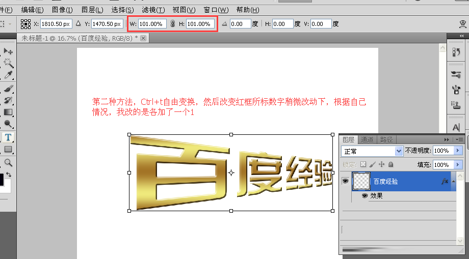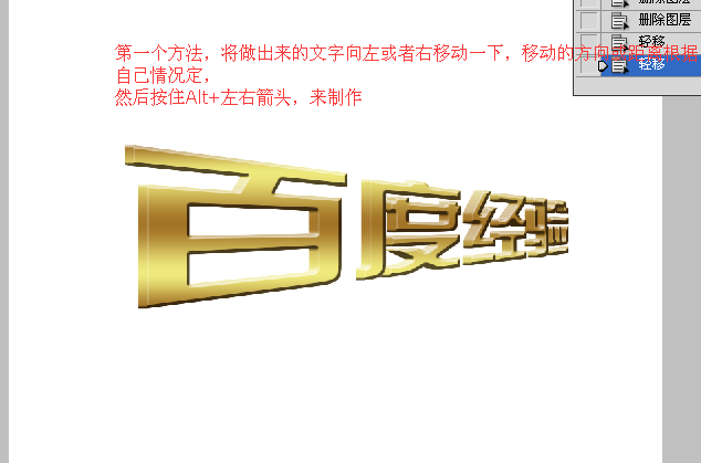 6、制作立體過程:第一種,手動的將文字移動相應位置,然后Alt+左右箭頭,做成立體文字。第二種,Ctrl+t自由變換如圖改變數(shù)值,然后Ctrl+shift+Alt+t做成立體文字