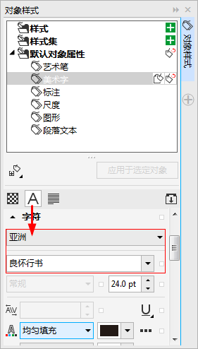 3. 選擇“美術(shù)字”之后,對(duì)象樣式面板會(huì)針對(duì)美術(shù)字的設(shè)置展開(kāi)一系列選項(xiàng)。選擇字符屬性,然后更改“全部腳本”改為“亞洲”(這樣是為了方便查找),字體根據(jù)喜好自行選擇,這里以“良懷行書(shū)”為例。“美術(shù)字”默認(rèn)字體設(shè)置完畢。
