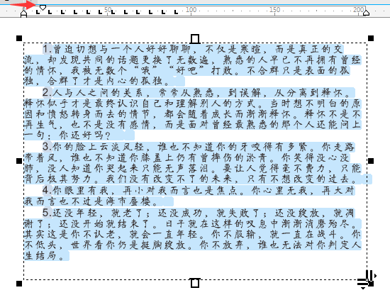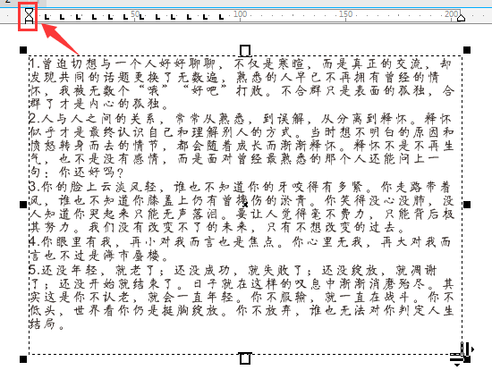 1. 使用F8“文本工具”,在CDR繪圖區(qū)域拖動鼠標實現(xiàn)段落文本框,在框內單擊添加段落文字,或者也可以從已有文字中復制文本到文本框。如圖所示。