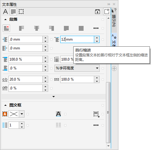 2. Ctrl+A全選所有文字,點擊菜單欄“文本屬性”按鈕(快捷鍵Ctrl+T)。在彈出的“文本屬性”面板中選擇“段落”屬性,設置“首行縮進”量,如圖所示。
