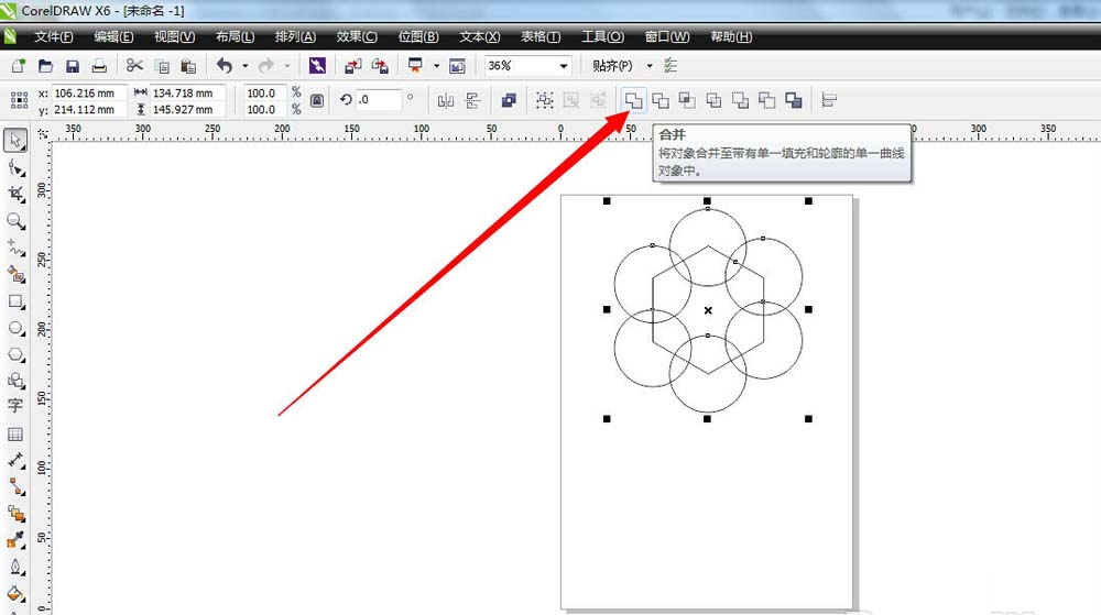 5、把頁面上的所有正圓、六邊形圖形一起選中,點擊工具欄里的“合并”圖標按鈕