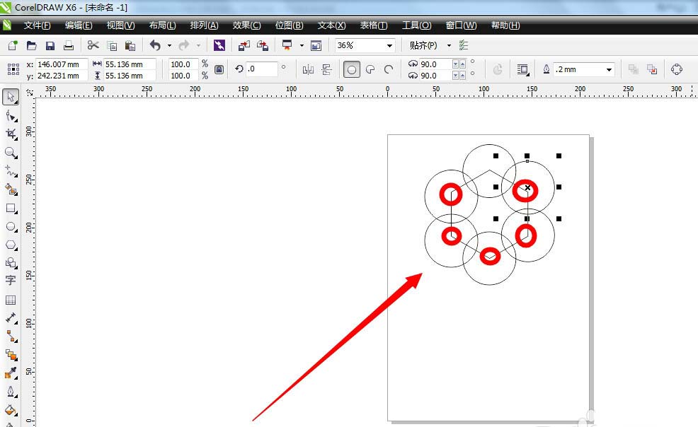 4、再復制五個正圓,分別移動到正六邊形剩下的五個頂點處,中心點都與頂點重合