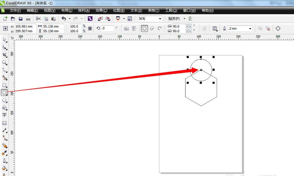 3、接著按住ctrl鍵,在頁面上繪制一個正圓圖形,并且把正圓移動到正六邊形上面,讓正圓的中心點與正六邊形的其中一個頂點相重合