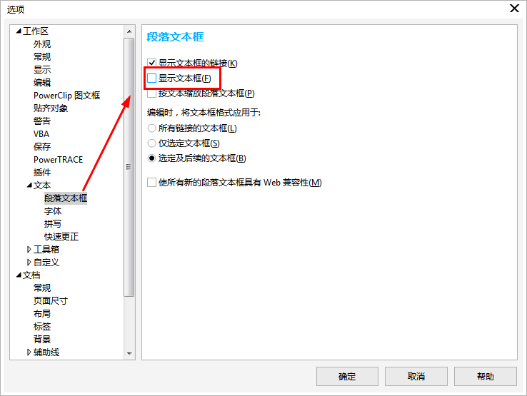 方法二:執(zhí)行“工具>選項”,快捷鍵Ctrl+J,在彈出的“選項”對話框的左側(cè)欄中展開“工作區(qū)>文本>段落文本框”,在右側(cè)出現(xiàn)的“段落文本框”面板中將“顯示文本框”前的勾去掉。