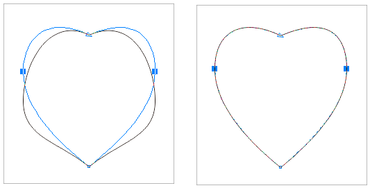 4. 然后框選住中間的兩個節點,按住Ctrl鍵,拖動鼠標左鍵垂直向上拖動,如下圖(左)所示。到適當位置,松開鼠標,確定圖形,一個心形的圖形框架就出來了,如下圖(右)所示。