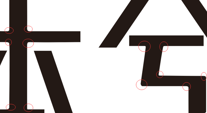 ⑤ 然后我們需要做的是,對矩形造字細節的調整,因為我們在用矩形拼接時候,可能沒有對得很齊,字顯得毛糙,另外我們曲線造字是一種比較圓滑的字體設計,所以我們需要把矩形造字產生的尖角倒一下圓角,圓角不需要太大,看著舒服就好