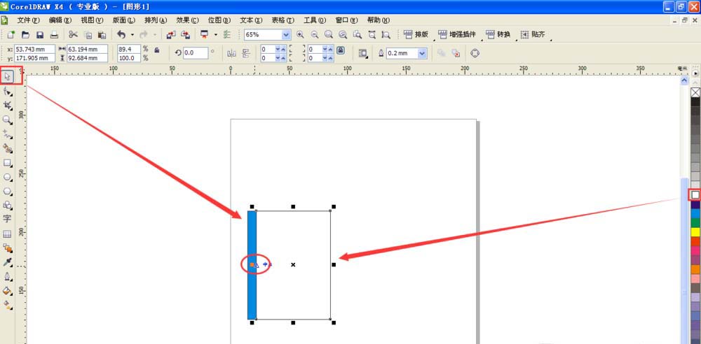 2、選擇挑選工具,在重點的地方,用鼠標左鍵向右拖動,按住鼠標右鍵,復制一個矩形,然后在右邊,用鼠標左鍵選擇白色進行填充。