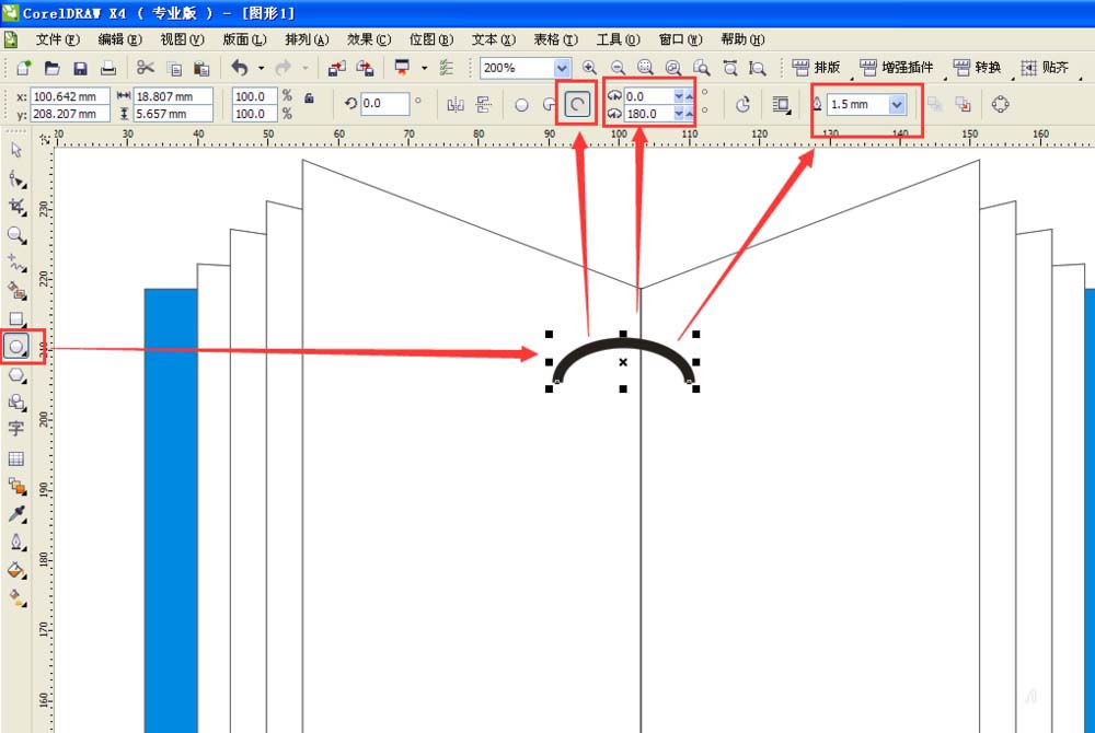 7、用橢圓工具繪制一個圓弧,修改屬性0-180度,調節輪廓大小。