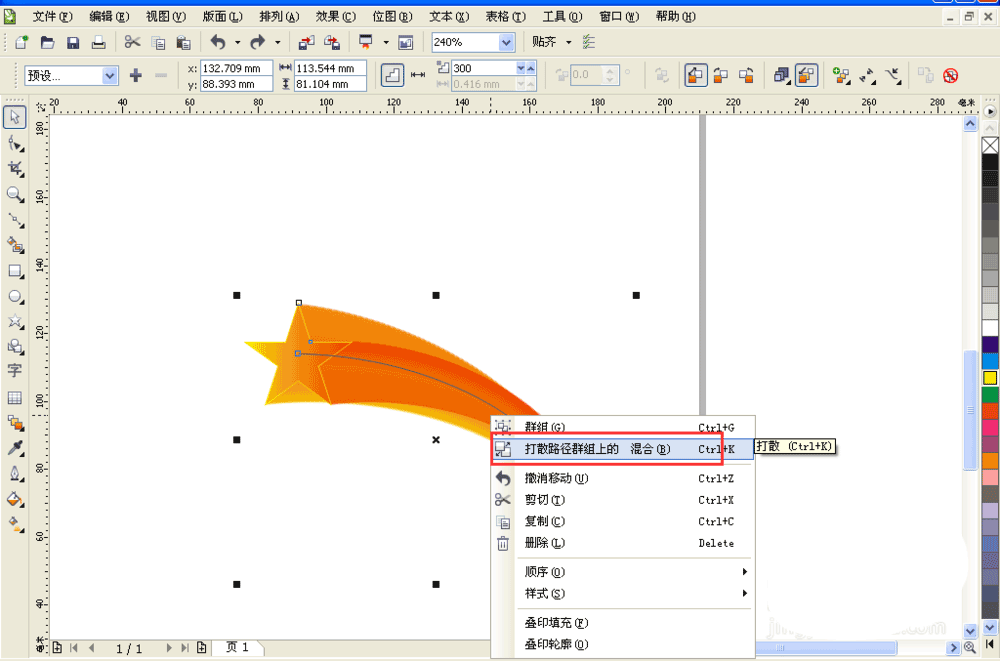 8、點(diǎn)擊弧形星星選中右擊打散路徑群組上的混合,點(diǎn)擊弧線刪除。