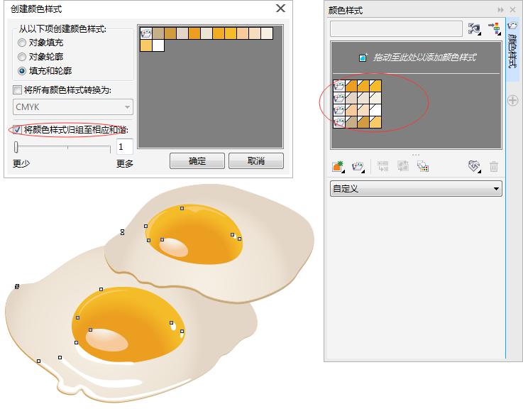 7. 將選擇的對象拖到“顏色樣式”泊塢窗的和諧組框內,在彈出的“創建顏色樣式”對話框中選擇“將顏色樣式歸組至相應和諧”復選框,單擊“確定”按鈕,即可利用選擇對象的填充顏色和輪廓顏色創建顏色樣式,新建的和諧組顏色樣式顯示在“顏色樣式”泊塢窗中。