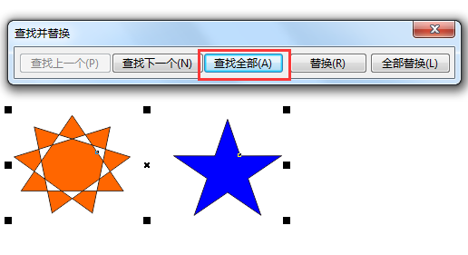 5. 點擊“完成”按鈕之后,彈出“查找并替換”窗口,然后單擊“查找全部”命令,則繪圖頁面中得所有RGB顏色圖形被選中(此步驟可省略),如圖。