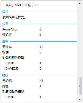 2. 在“文檔屬性”里面可以看到整個文檔的信息,包括查看文件顏色信息、物件數量、字體、顏色、位圖等等。
