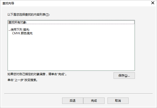 以CMYK為例,點擊“完成”之后,查找全部即可,經過查找之后的文件會被選中。