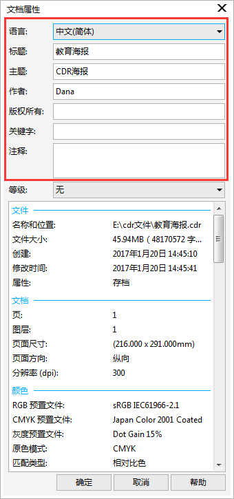 使用CorelDRAW您可以向繪圖添加參考信息,如語言、標題、作者、主題、關(guān)鍵字、等級和其它注釋。盡管添加文檔信息是可選的,但是添加這些信息可使以后組織和定位繪圖更加容易。除此之外,還可以訪問其它重要的文檔信息,如繪圖包含的頁數(shù)和圖層數(shù)、字體、對象和文本統(tǒng)計信息以及對象類型。您還可以查看顏色信息,如用于定義文檔顏色的顏色預置文件以及原色模式和匹配類型。