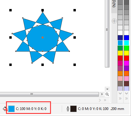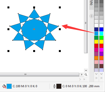 3. 使用任意圖形工具繪制一個造型,并處于選擇狀態(tài),然后左鍵單擊右側調色板的任意顏色,即可填充對應的顏色。您可以選擇CMYK或RGB顏色(通過調色板顯示兩種模式顏色稍有差別)。