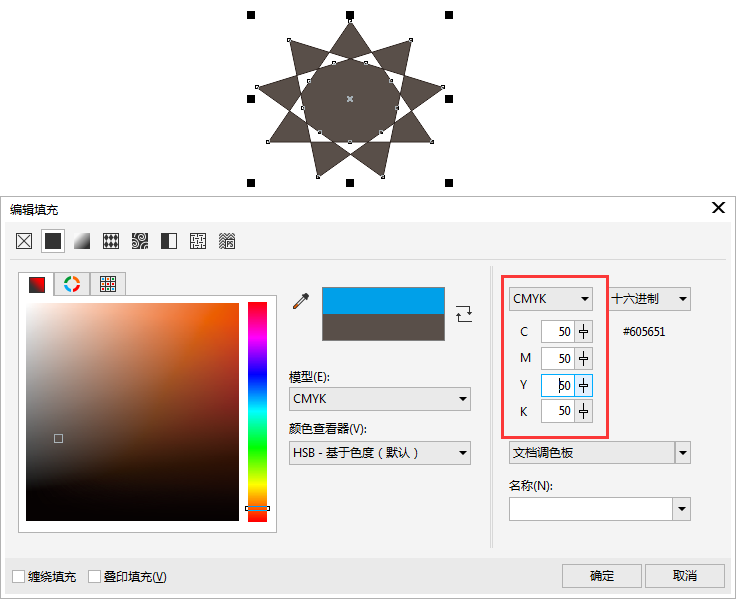 5. 在彈出的“編輯填充”對話框中通過紅色框位置,對CMYK色值進行手動輸入數(shù)值,可獲得精確的顏色,如圖。