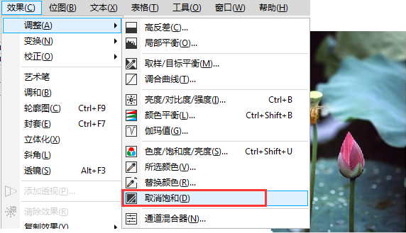 2、執(zhí)行"效果>調(diào)整>取消飽和"去除圖片顏色,