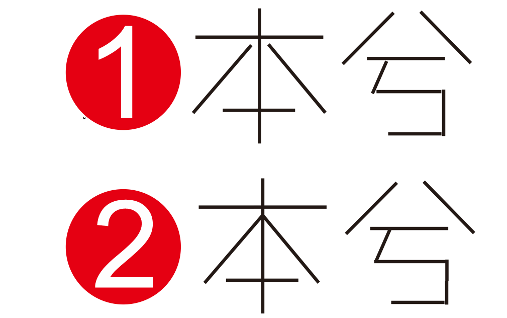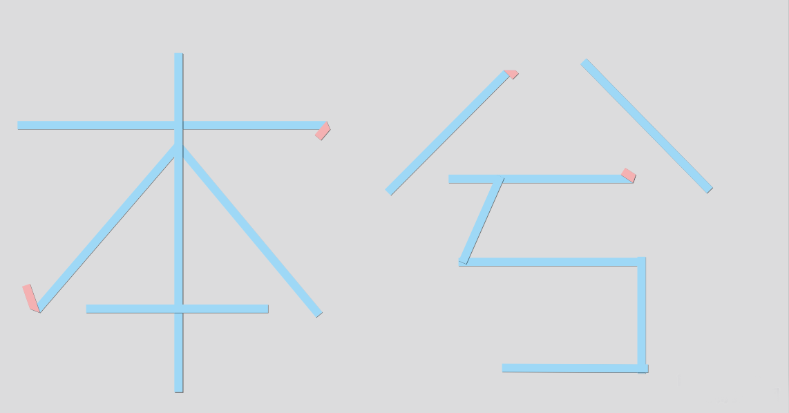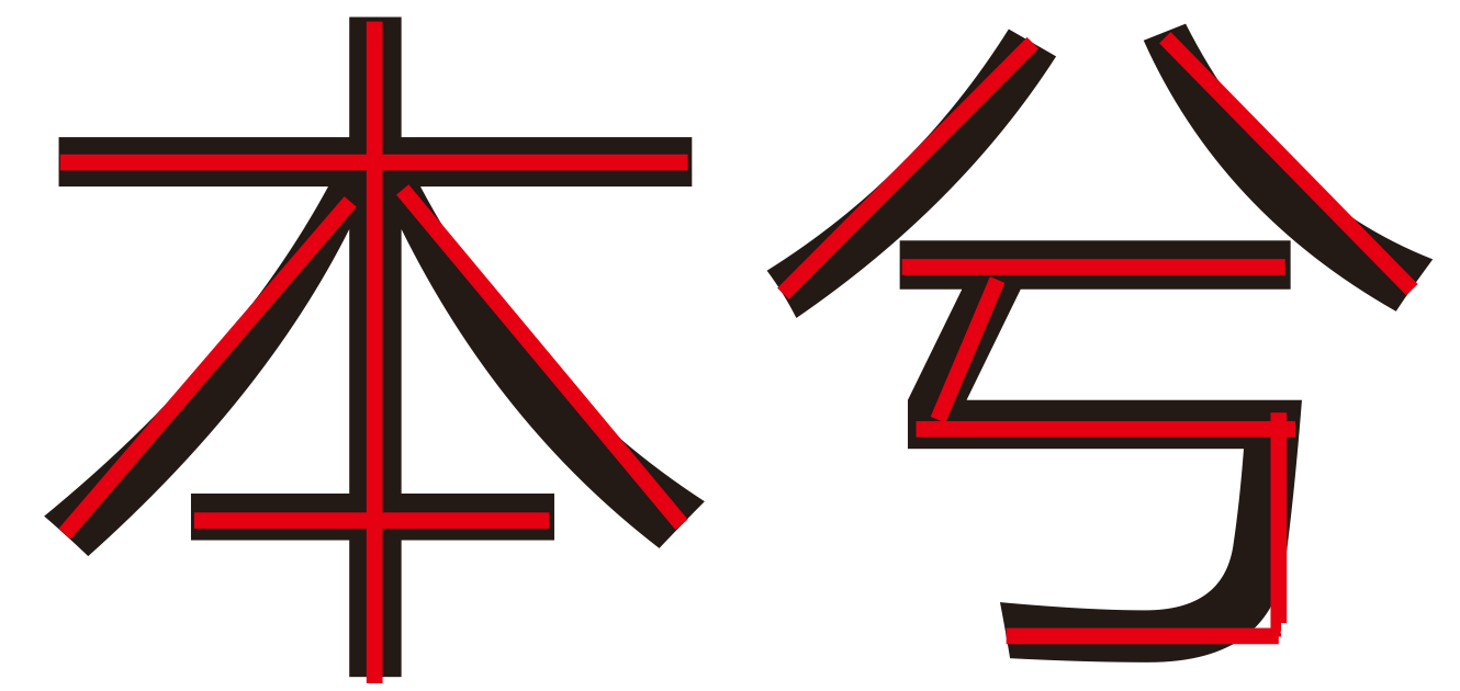 這就是最終的效果了,不過我為什么翻過來的是這2個筆畫呢,那是因為本的豎這一筆連接著其他是所有筆畫,如果把豎翻過來則貫穿了整個本字,藍色和紅色的對比效果我個人覺得是最好的,而折邊的地方也不是隨意的,本兮二字的折邊都是按照:一左一右,一上一下的規則進行選擇的結果,因為這樣的對比是最好的!