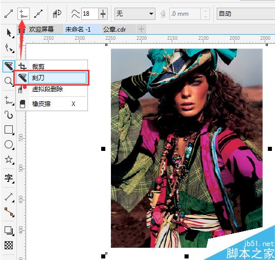 步驟2:在工具箱中單擊“刻刀工具”,選擇屬性欄上的“手繪線模式”按鈕。