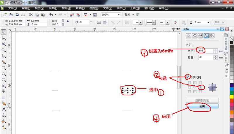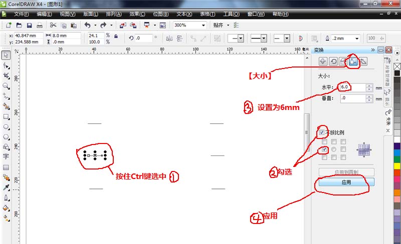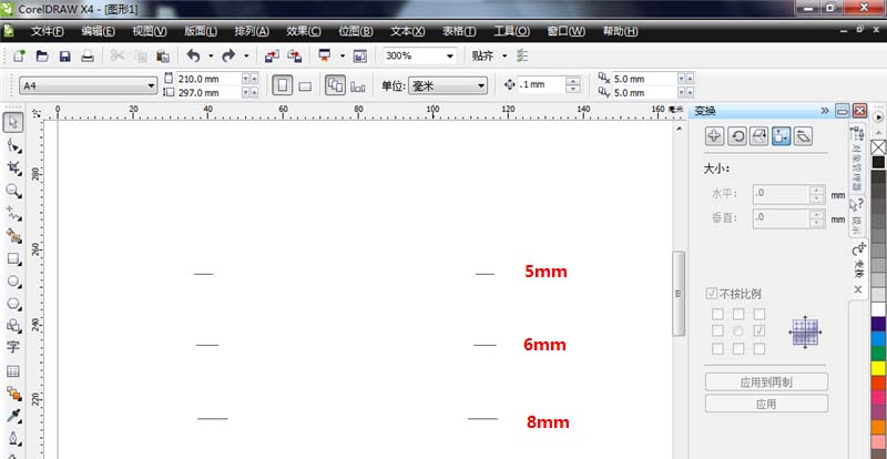 2、選中兩條線段,復制兩次。將【變換】工具組切換到【大小】,按住Ctrl鍵,選中其中一組的左側線段,用【大小】工具,勾選【不按比例】,鎖定左端,將其長度改為6mm;再選中其右端線段,鎖定右端,同樣將其長度改為6mm。再用相同方法,將另一組的兩條線段長度改為5mm。