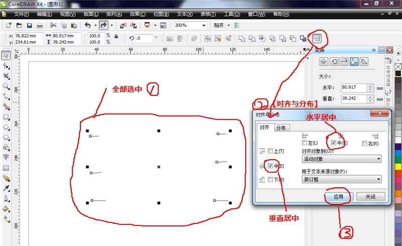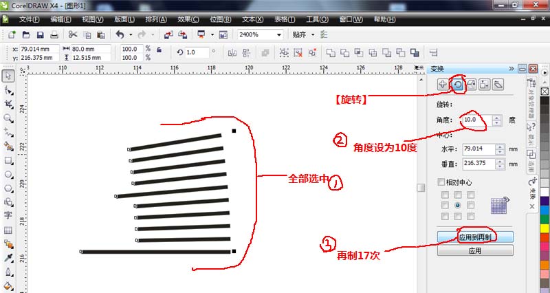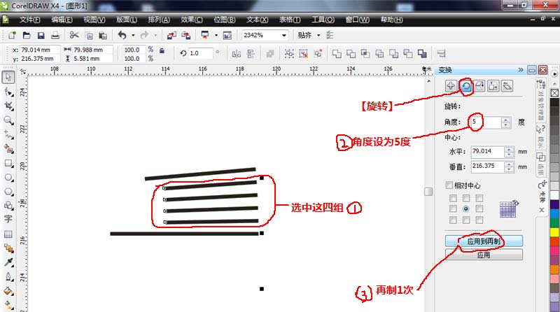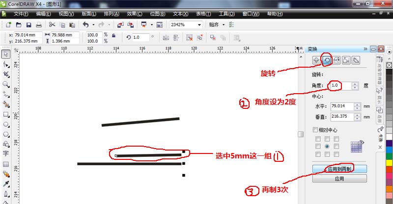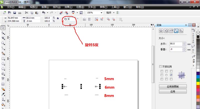 3、將線段為5mm的那組旋轉1度,線段為6mm的那組旋轉5度,線段為8mm的那組保持不變。全部選中,用【對齊與分布】將其水平居中、垂直居中對齊(或直接按快捷鍵C和E鍵)。