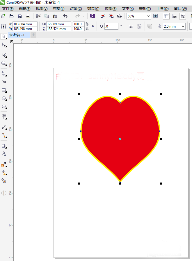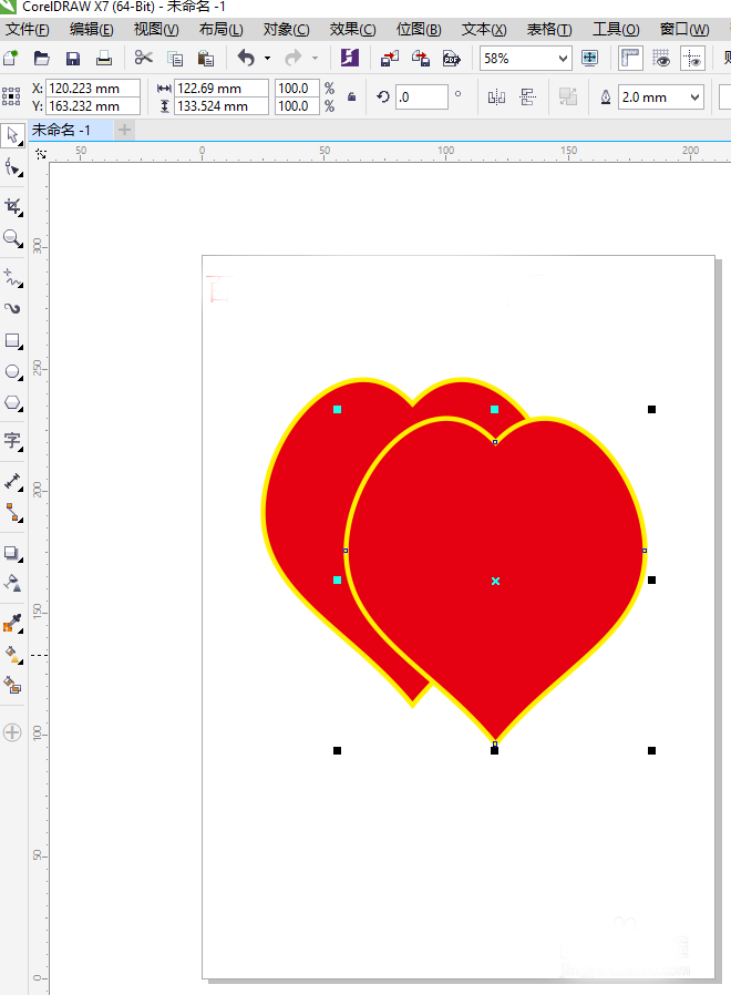5、選中所有圖形,選擇屬性欄中的合并;合并后,在選擇工具箱中的形狀工具,選中節(jié)點(diǎn),點(diǎn)擊屬性欄中的連接兩個節(jié)點(diǎn)。連接后填充顏色,左鍵單擊右邊的顏色填充紅色,右鍵單擊右邊的顏色描邊黃色。